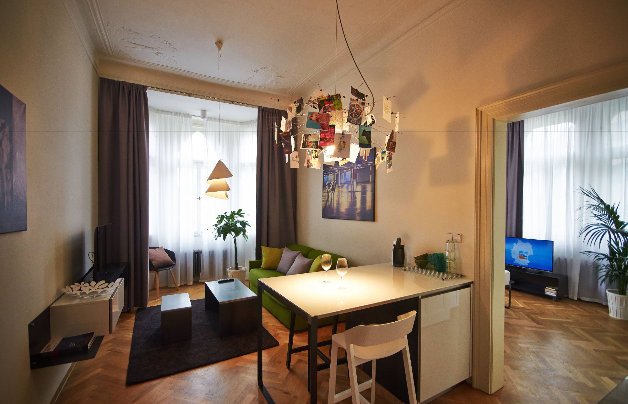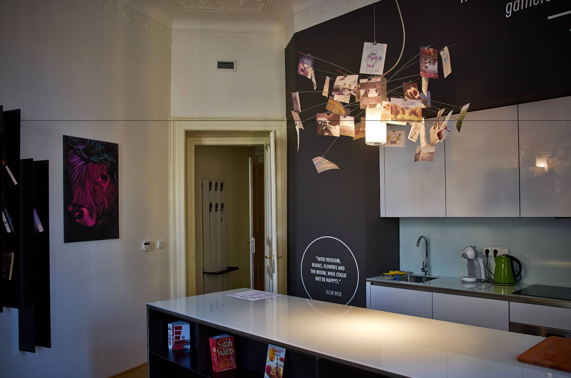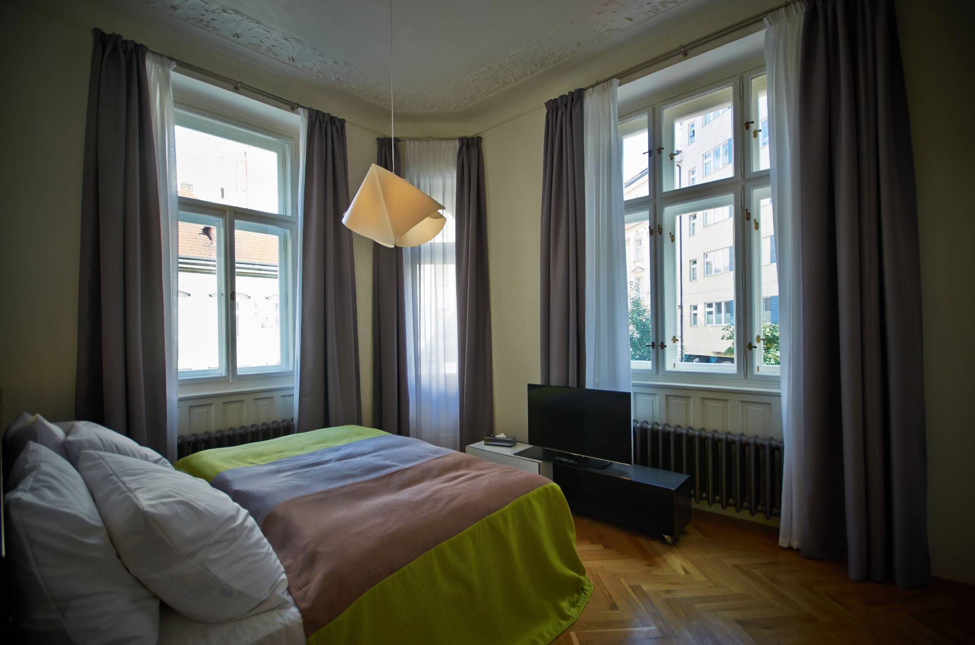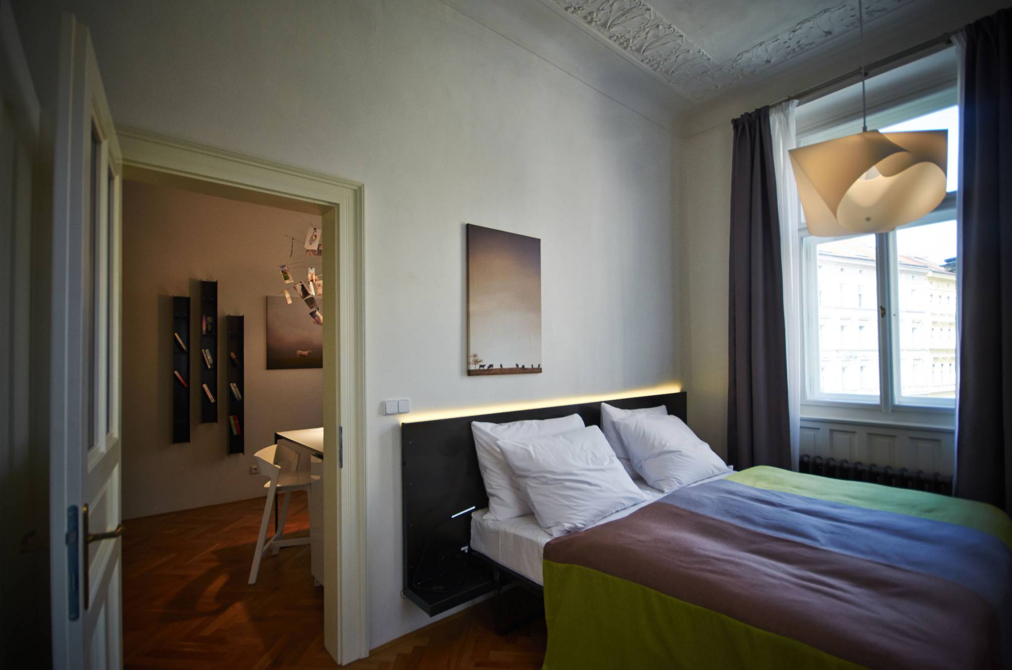 Návrh interiérů historického apartmánového objektu Myslíkova 22. Původní byty byly přestavěné na nové apartmány a kompletně vybavené. Historické apartmány jsou doplněné jednoduchým nábytkem navrženým na míru z černé oceli, mléčného skla a starého dřeva. Zbytek je ponechán v bílé a šedé barvě. Vybrané stěny jsou barvené do tabulové černé barvy a doplněné grafikou.