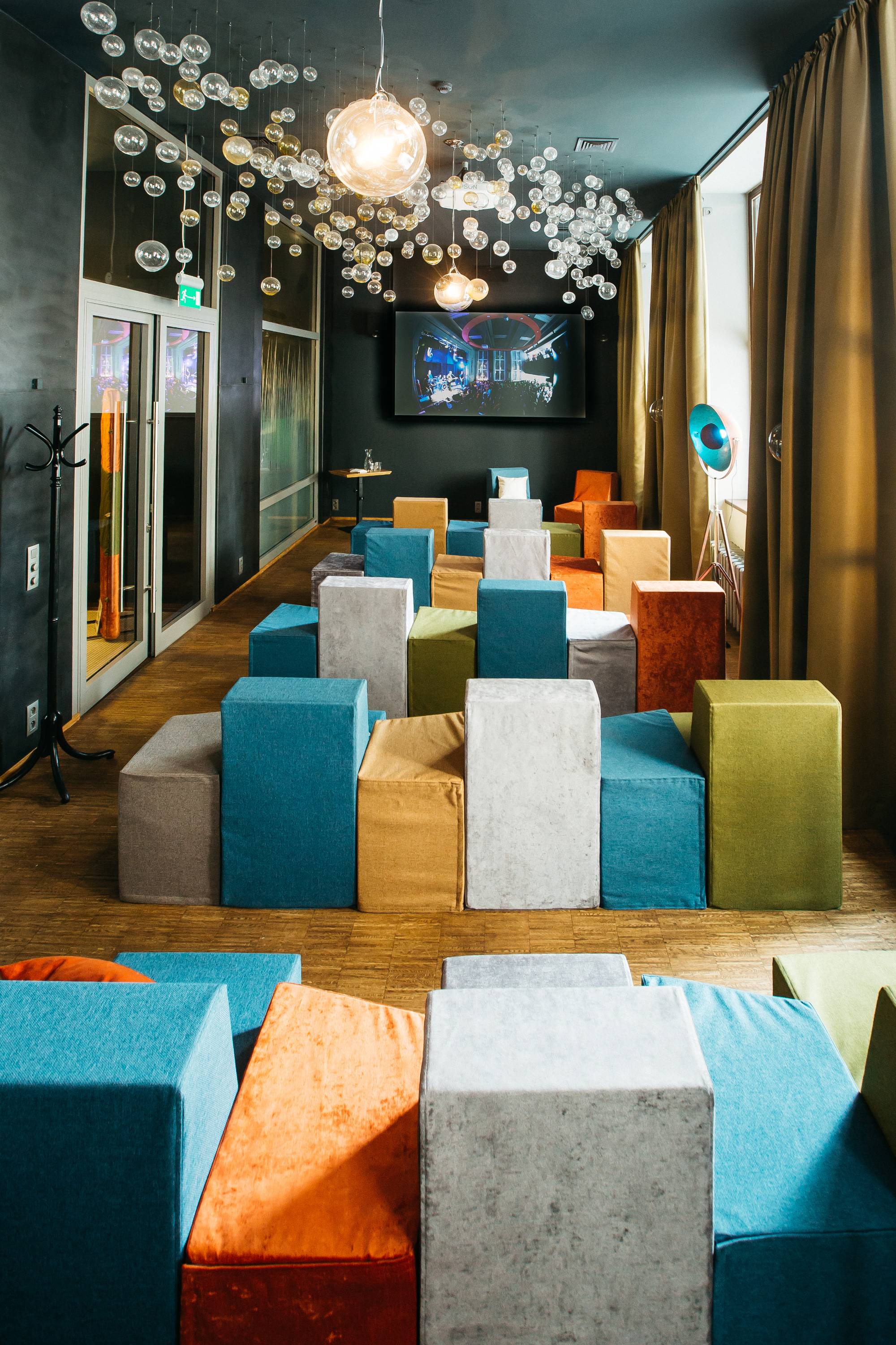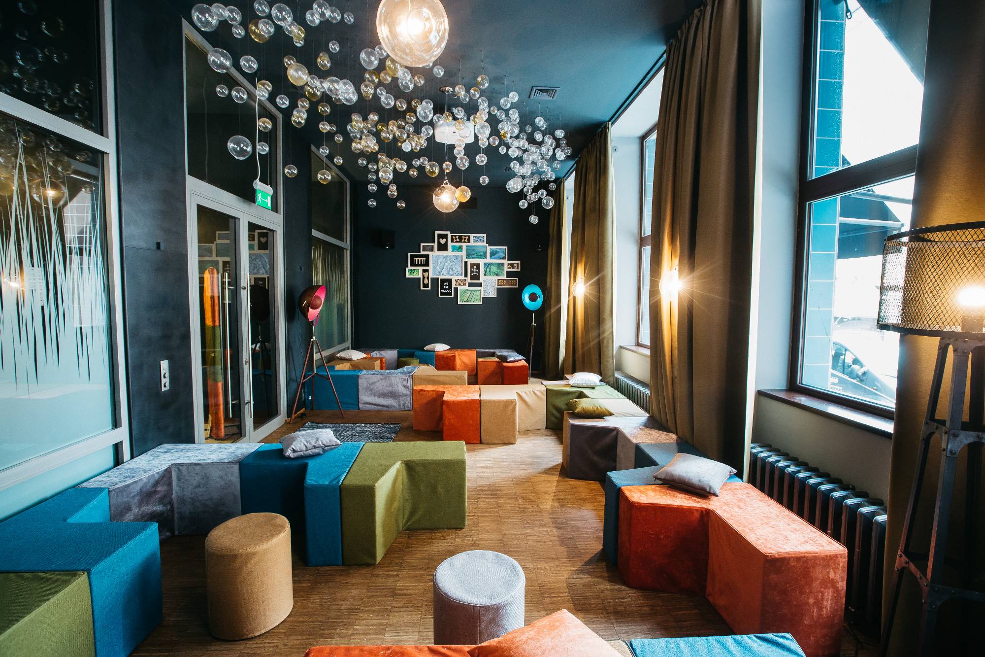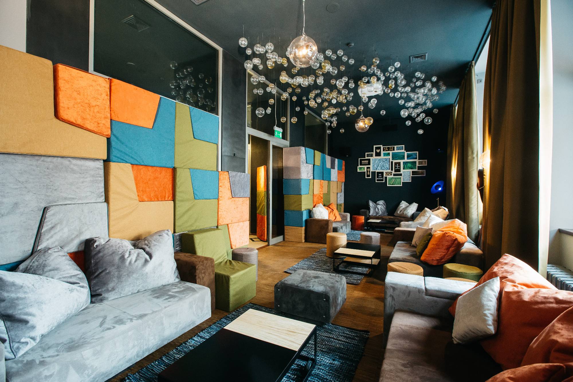 Návrh rekonstrukce přízemí hotelu Mosaichouse, ul. Odborů, Praha - Nové město. Požadavkem investora byla rekonstrukce a modernizace hotelové kuchyně. V průběhu projektu vznikly další požadavky na úpravy restaurace a dalších prostor ve vstupním podlaží hotelu. Původní interiér navržený v roce 2010 byl barevně umírněn, doplněn dřevem a šedými výmalbami. Pro lounge jsme navrhli a nechali vyrobit modulární stohovatelný sedací nábytek složený z křesel a taburetů, který může být použit pro různé typy sezení (jednání, prezentace, kino), nebo může být vyskládán ke stěnám. Dále jsme interiéry doplnili novými svítidly, námi navrženými konferenčními stolky a vyvýšeným DJ pultem pro hlavní sál.