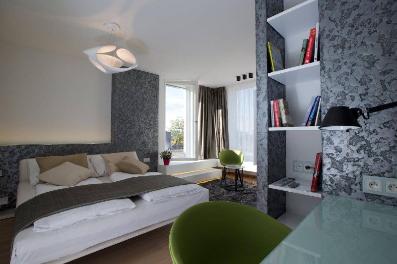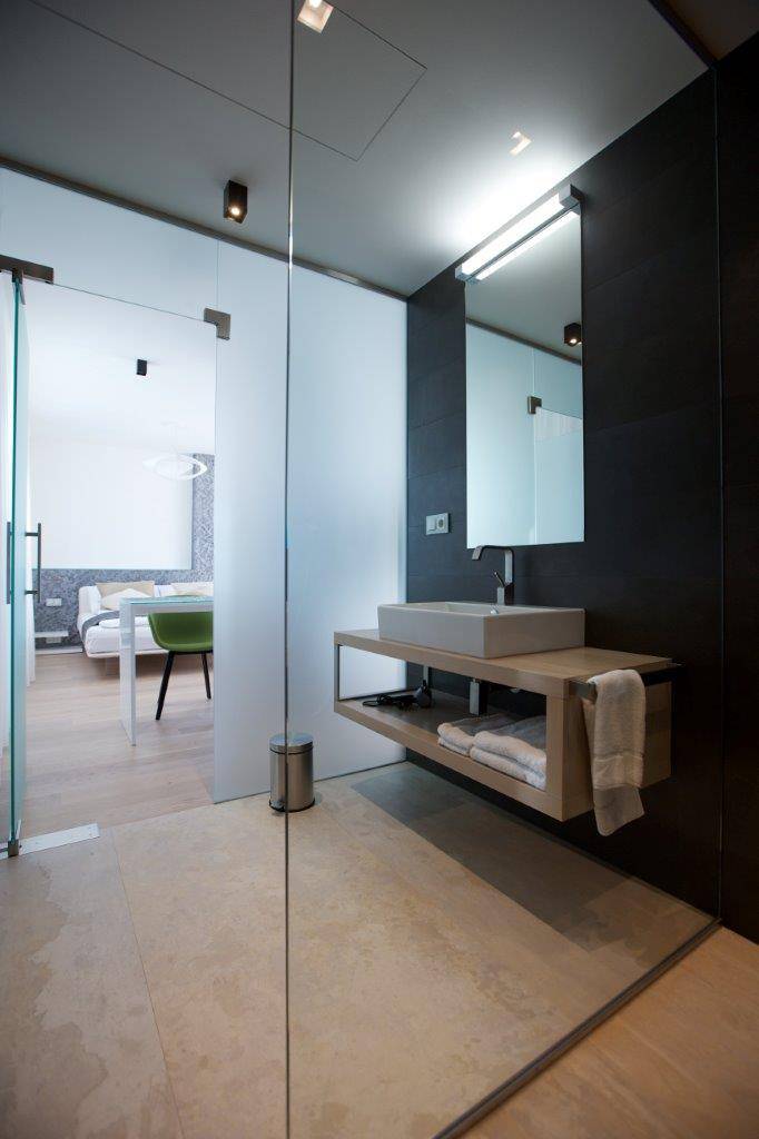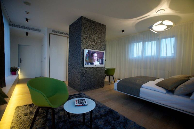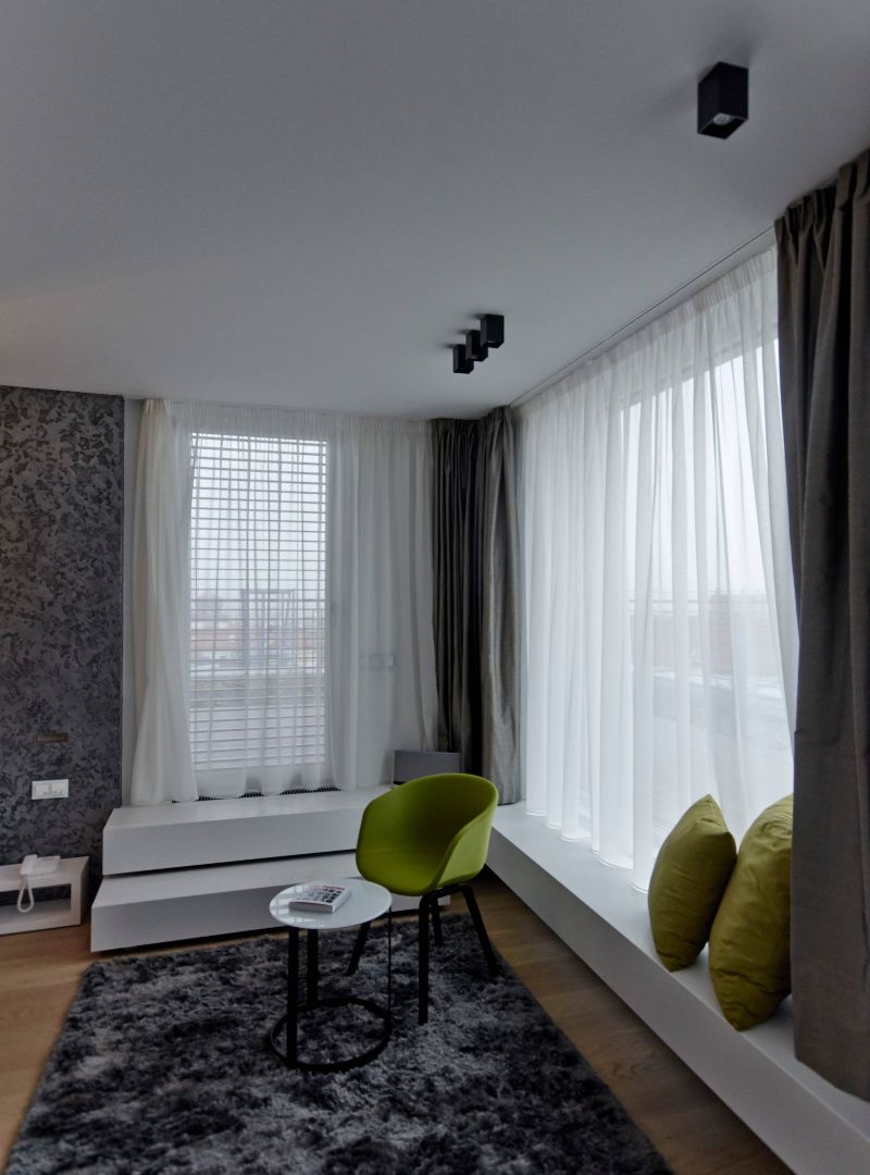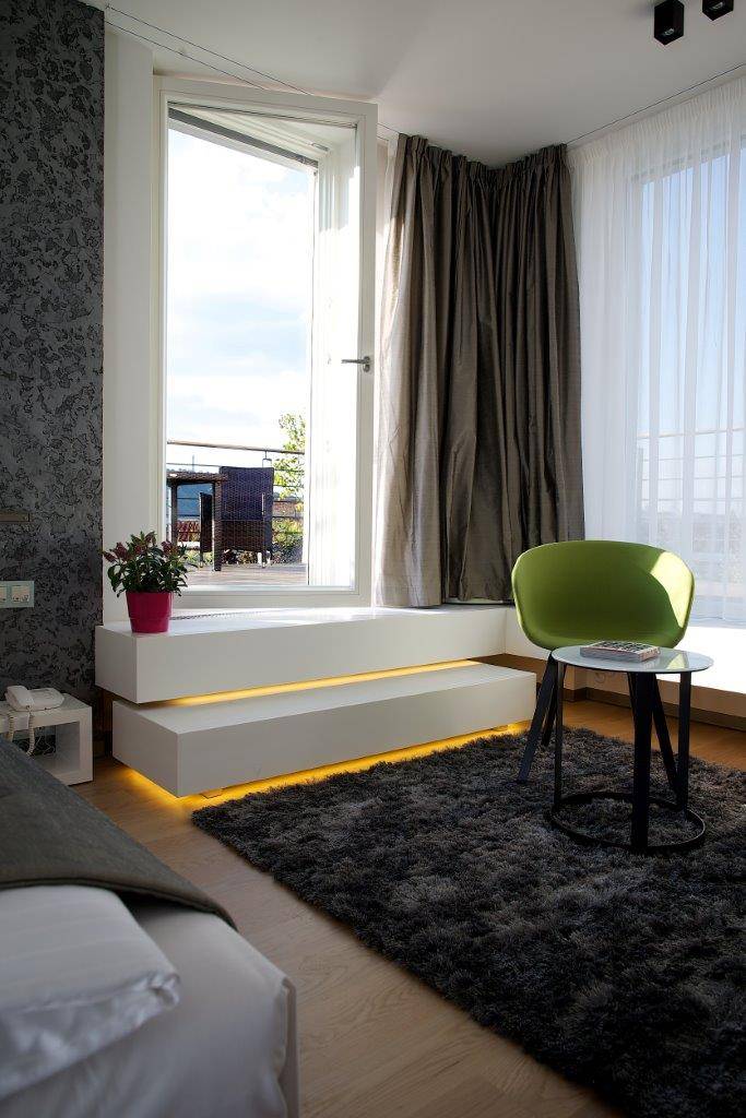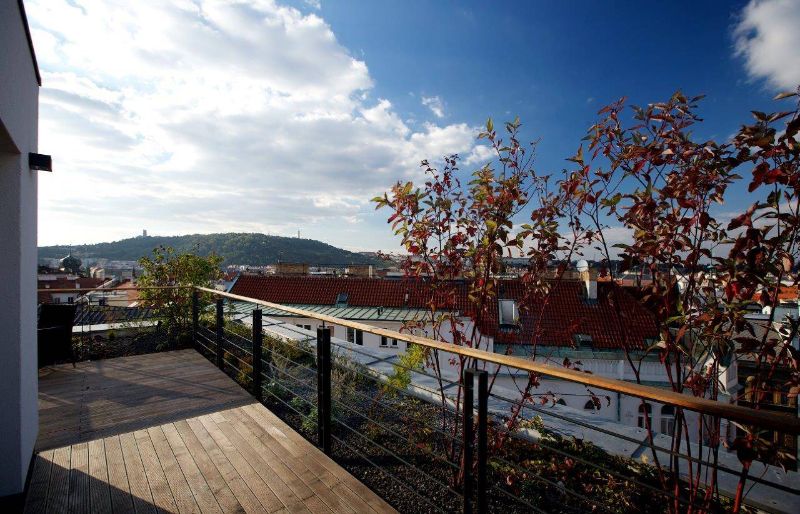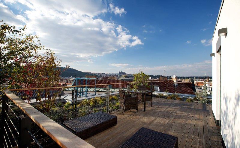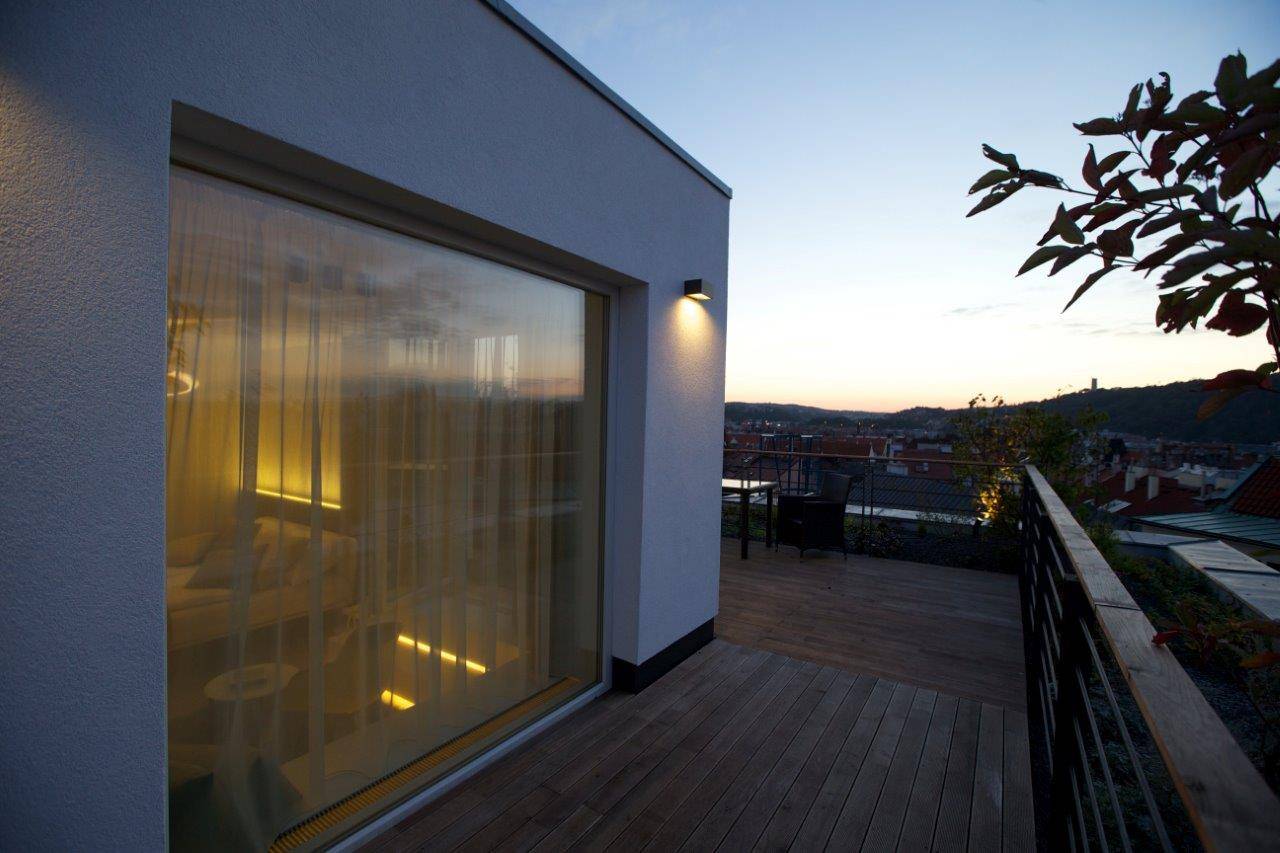Studie a projekt interiérů a teras střešní nástavby na hotel Mosaichouse, v ulici Odborů, Praha. Dva střešní hotelové apartmány (Penthouse east a Penthouse west) byly navržené jako VIP apartmány hotelu s vlastními terasami a nádherným výhledem na Prahu a Pražský hrad přes historické střechy z Karlova náměstí. Apartmány byly navrženy v luxusních materiálech a vybavení, ale účelně tak aby splňovaly nejen funkci přespání ale i mohly sloužit jako příjemné místo pro odpočinek, nebo práci pro náročnější hosty hotelu. Podlaha je z dřevěných dubových prken, parapety jsou navržené v corianu, sloupy a části stěn z luxusní italské cementové stěrky. Koupelny jsou obložené z velkoformátových obkladů a dlažeb. Na návrhu terasy a střešní zahrady jsme spolupracovali s ateliérem Flera.