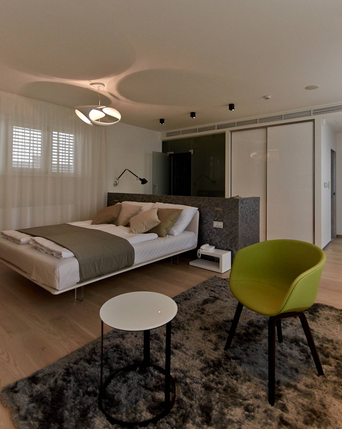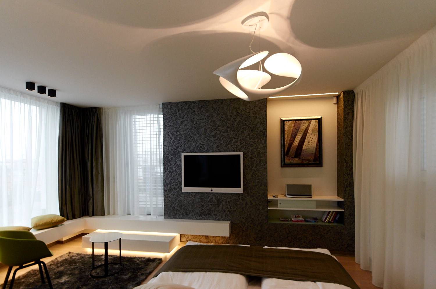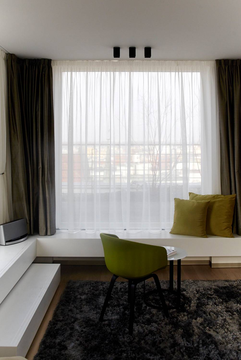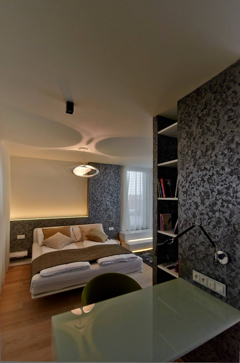 Studie a projekt interiérů a teras střešní nástavby na hotel Mosaichouse, v ulici Odborů, Praha. Dva střešní hotelové apartmány (Penthouse east a Penthouse west) byly navržené jako VIP apartmány hotelu s vlastními terasami a nádherným výhledem na Prahu a Pražský hrad přes historické střechy z Karlova náměstí. Apartmány byly navrženy v luxusních materiálech a vybavení, ale účelně tak aby splňovaly nejen funkci přespání ale i mohly sloužit jako příjemné místo pro odpočinek, nebo práci pro náročnější hosty hotelu. Podlaha je z dřevěných dubových prken, parapety jsou navržené v corianu, sloupy a části stěn z luxusní italské cementové stěrky. Koupelny jsou obložené z velkoformátových obkladů a dlažeb. Na návrhu terasy a střešní zahrady jsme spolupracovali s ateliérem Flera.